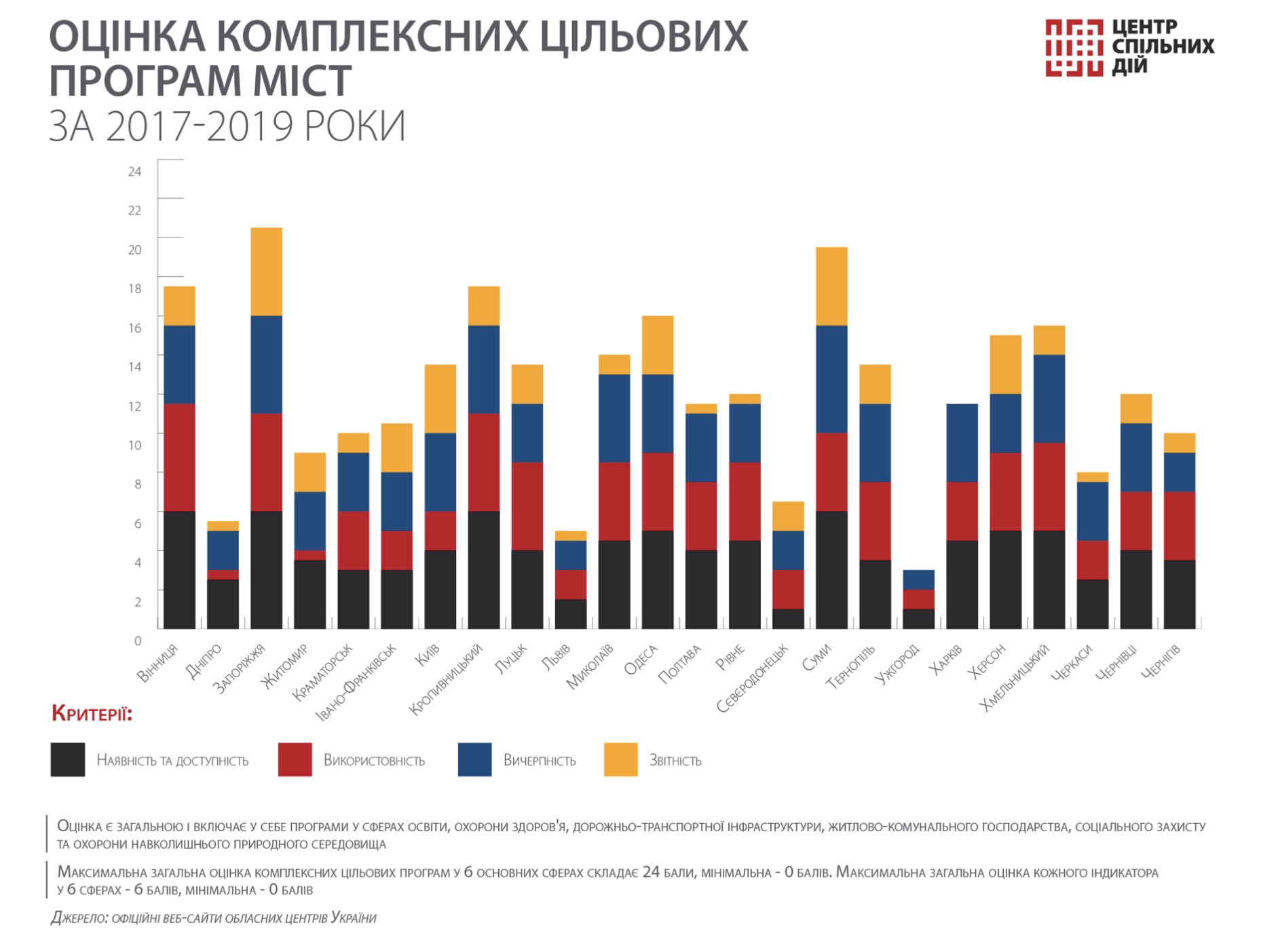 Ми у Центрі спільних дій проаналізували комплексні цільові програми 24 обласних центрів в шести сферах життя громад за 2017-2019 роки. До уваги брали сфери освіти, охорони здоров’я, соціального захисту, житлово-комунального господарства, дорожньо-транспортної інфраструктури та захисту навколишнього середовища. Оцінку програм аналітики Центру провели згідно з методологією, що включає чотири індикатори: наявність і доступність програм, їхня використовність – тобто зручність для опрацювання та аналізу, вичерпність – наявність чіткого плану та вимірюваних показників оцінки, звітність про їхнє виконання.