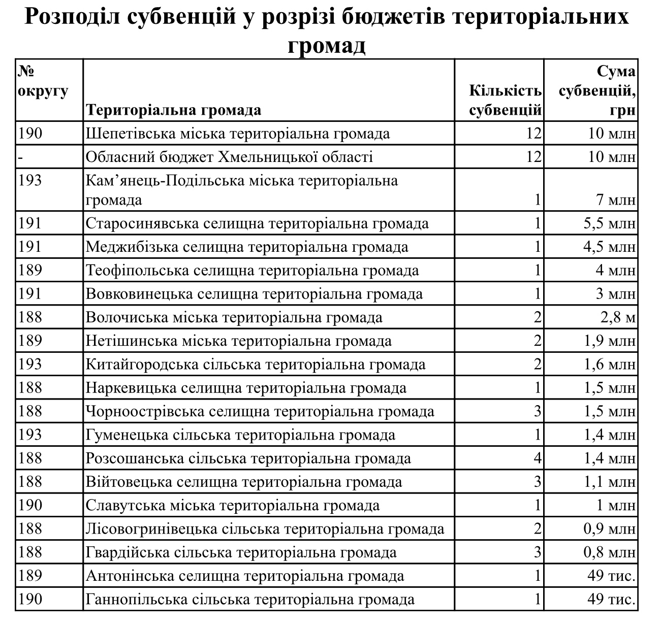 У розрізі бюджетів територіальних громад цього року найбільше державних грошей передбачено для обласного бюджету та бюджету Шепетівської міської територіальної громади – по 10 мільйонів гривень, а найменше – бюджетам Антонінської селищної та Ганнопільської сільської територіальних громад – по 49 тисяч гривень для придбання обладнання і предметів довгострокового користування (мультимедійних дошок, проекторів, ноутбуків, персональних комп’ютерів, БФП) для Ганнопільського НВК «ДНЗ – СЗШ I-III ступенів» та Великоорлинської гімназії.