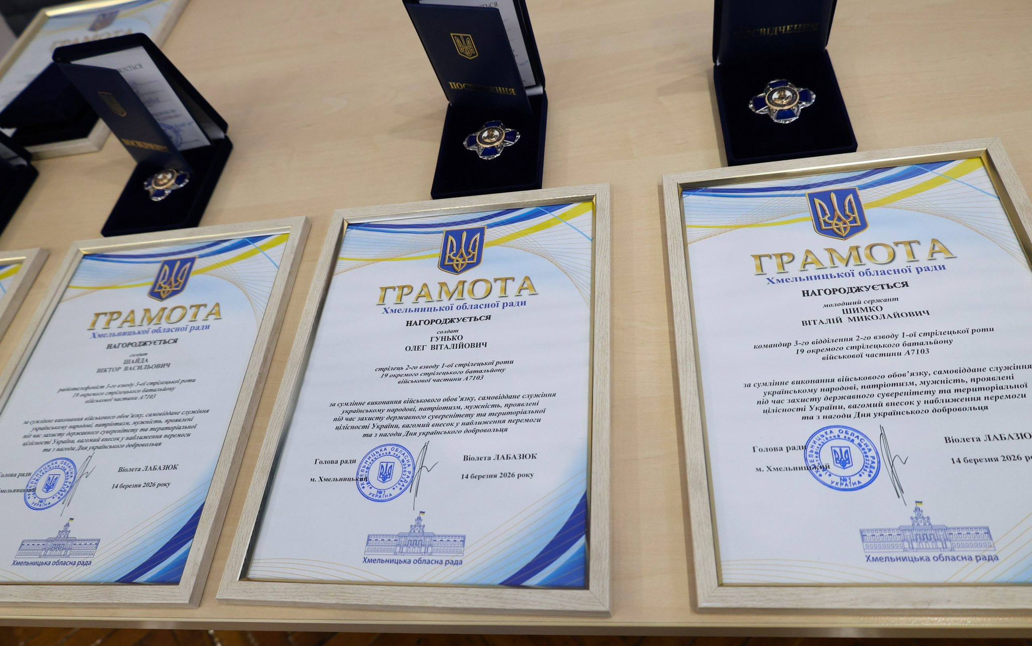 Чотирнадцятого березня вся країна вшановує людей, які за покликом серця обрали захищати рідну землю – українських добровольців. З цієї нагоди голова Хмельницької обласної ради Віолета Лабазюк зустрілася з військовослужбовцями, які стали на захист країни від російських окупантів, та вручила їм відзнаки.